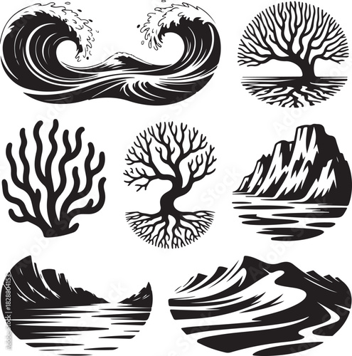 © vector silhuette, Obraz premium Monochrome Vector Landscape Elements Collection Featuring Waves Trees and Mountains