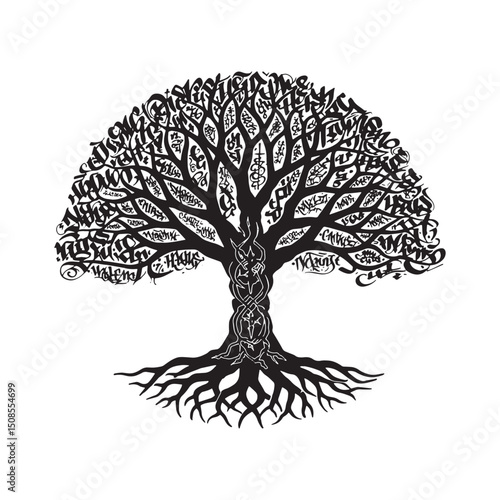 Naklejka premium Monochrome Vector of Yggdrasil Tree of Life with Graffiti Style