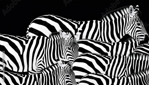 Fototapeta premium Monochrome wildlife portrait of a group of zebras, their intricate stripe patterns merging into a captivating optical illusion of natural art