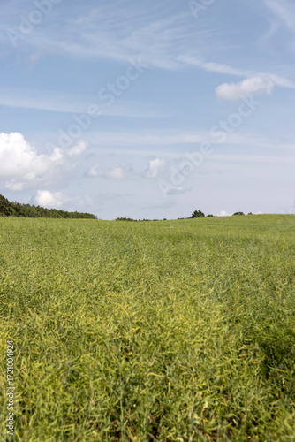 Fototapeta premium monocultural agricultural field with rapeseed pods on a warm summer day in cloudy weather, beautiful thin unripe rapeseed pods used for food and fuel production