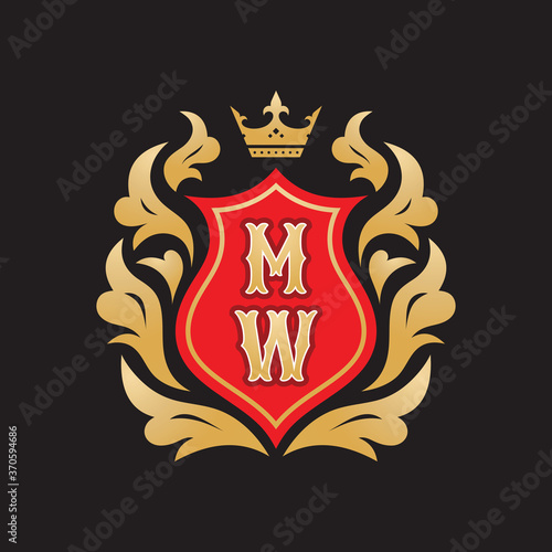 Obraz premium Monogram MW letters - concept logo template design. Crest heraldic luxury emblem. Red shield, golden leaves and crown. Initials M & W. Vector illustration.