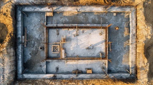 Naklejka premium Monolithic Foundation Construction: Top-Down View of Reinforced Concrete Slab...