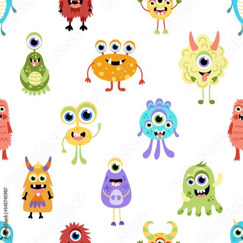 Fototapeta premium Monster seamless pattern. Cute jolly colorful monsters. Flat, cartoon, vector