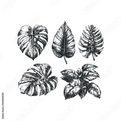 Fototapeta premium Monstera and tropical plant leaves collection sketch