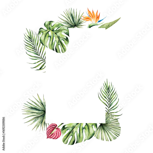 © Natalia, Naklejka premium Monstera leaf frame, Strelitzia and red anthurium flowers template. Watercolor hand drawn palm areca, vibrant green tones. Isolated botanical illustration on transparent background. Perfect for