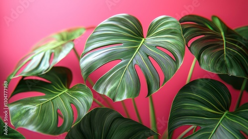 © afif, Naklejka premium Monstera leaves against vibrant pink wall. Botanical close-up. Possible use home decor, interior design, nature