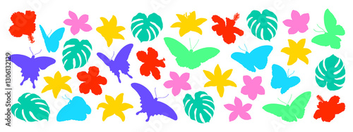 Fototapeta premium Monstera leaves, various flowers and butterflies on transparent background, colorful silhouette illustrations, tropical illustration collection