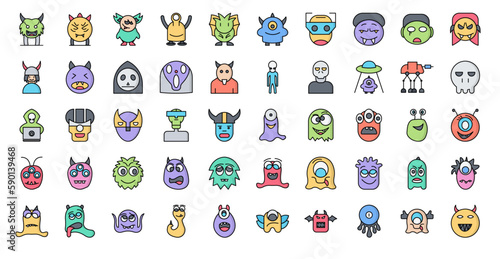 Fototapeta premium Monsters Color Line Icons Monster Icon Set in Filled Outline Style 50 Vector Icons