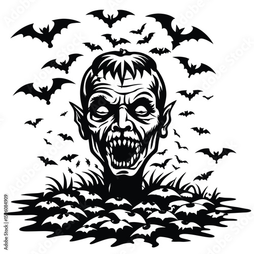 Fototapeta premium Monstrous zombie head emerging from ground surrounded by bats