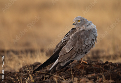 © Dr Ajay Kumar Singh, Obraz premium Montagu's harrier perched on rock at Bhigwan bird sanctuary, Maharashtra