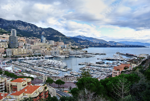 © Ivars, Fototapeta premium Monte Carlo, Monaco - Houses in bright colors on the shores of the Mediterranean Sea, a bay with moorings on which there are yachts, the sky with white-gray clouds.