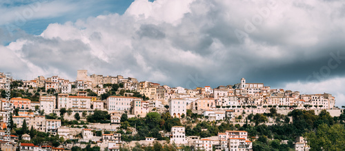 © Great Brut Here, Obraz premium Monte San Biagio, Italy. Top View Of Residential Area. Cityscape In Autumn Day Under Blue Cloudy Sky