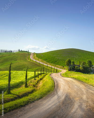 © stevanzz, Obraz premium Monteroni d'Arbia, route of the via Francigena. Winding road. Siena, Tuscany. Italy