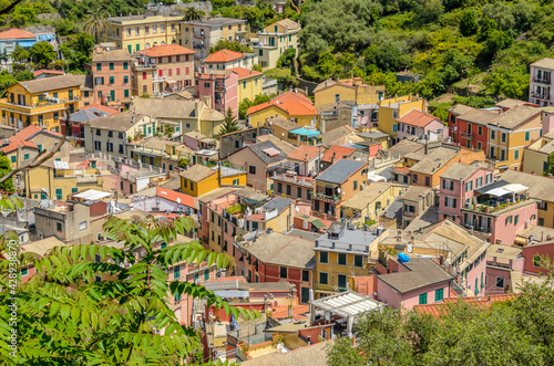 Naklejka premium Monterosso in Cinque Terre, Italy, view at the town from mountain trail