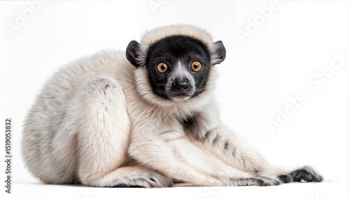 Naklejka premium monthold Crowned Sifaka Sitting Gracefully against a White Background, Capturing Innocence and Playfulness in Soft Lighting.