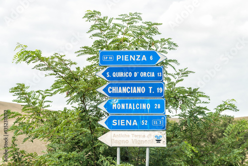 Fototapeta premium Monticchiello, Italy town village in Tuscany during sunny summer day and highway road street with blue exit direction sign for Pienza and Siena
