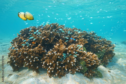 Obraz premium Montipora coral with a shoal of tropical fish underwater in the Pacific ocean, Polynesia, Cook islands