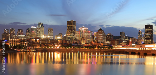 Naklejka premium Montreal skyline at dusk with lights reflections on St Lawrence River in Quebec, Canada