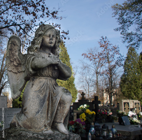 © Hanna Ohnivenko, Fototapeta premium Monument and candles in the cemetery. All Saints Day in Poland.