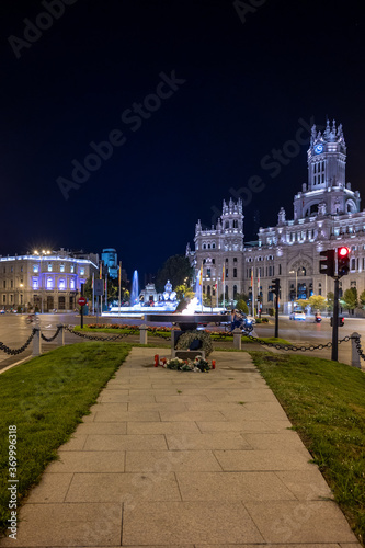© Fernando, Naklejka premium Monument in tribute to the victims of Covid-19 consisting of an eternal flame in front of the Plaza de Cibeles and the city hall in Madrid, Spain