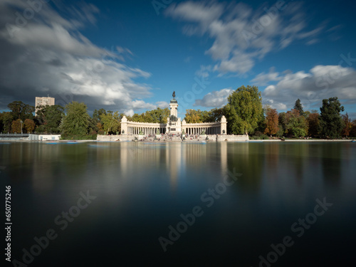 © Oscar, Fototapeta premium Monument to Alfonso XII with a lake with boats in front at a sunset with clouds