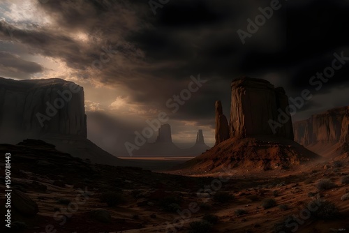 © DIEP, Fototapeta premium Monument Valley: A dramatic panorama unfolds, showcasing towering mesas under a stormy sky, a testament to the raw, untamed beauty of the American Southwest.