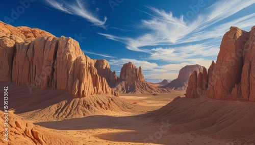 Fototapeta premium Monument Valley's Majestic Desert Landscape Under a Clear Blue Sky with Clouds