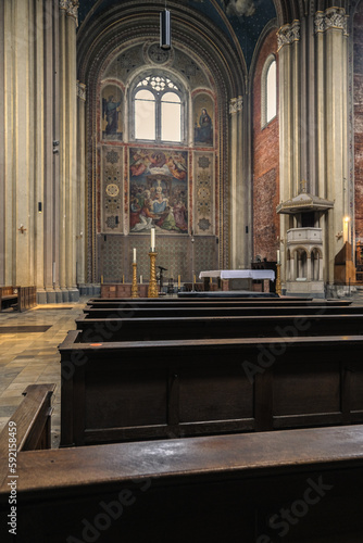 © Tamme Wichmann, Fototapeta premium Monumental church building in Gothic in neo-romanesque arch style with large ceiling and altar murals and fresco, opulent detailed columns and marble structures