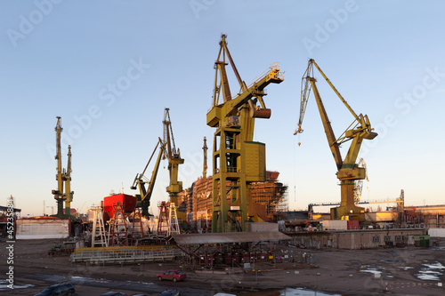 © Nightman1965, Fototapeta premium Monumental shipyard cranes in Gdansk, Poland.