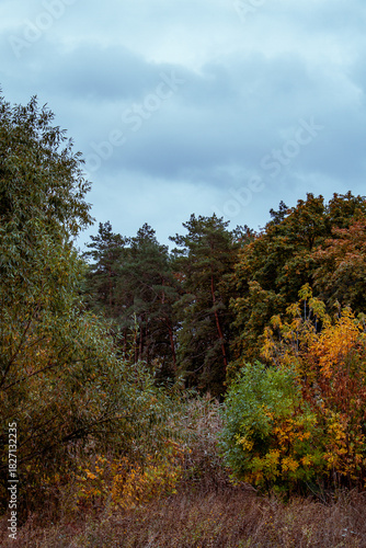© Дмитро Ганжеєв, Fototapeta premium Moody autumn forest edge under heavy blue cloudy sky