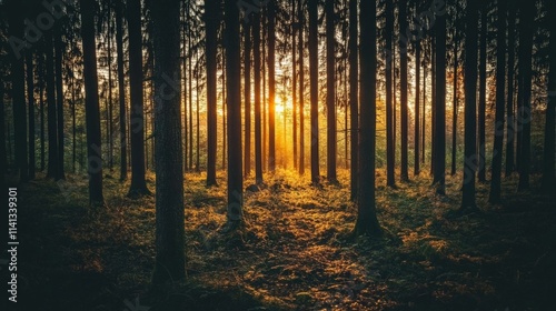 Obraz premium Moody Autumn Forest with Sunlight Through Trees