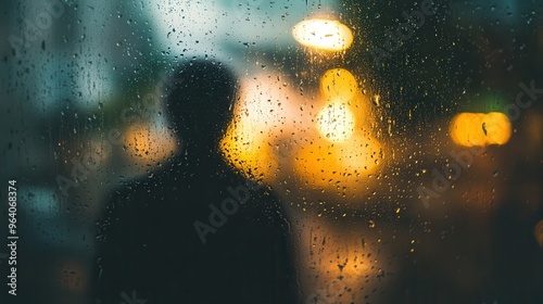Obraz premium Moody Cinematic Rainy Window Scene with Blurry Figure Looking Outside