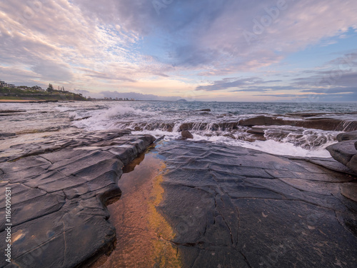 Obraz premium Moody Coastal Morning with Waves Crashing on Rocks