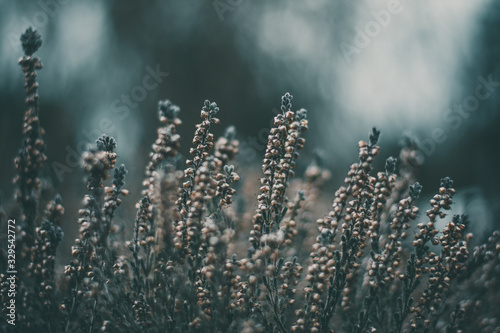 Fototapeta premium Moody dark close-up of heather (Calluna vulgaris) plant in woods. Shallow...
