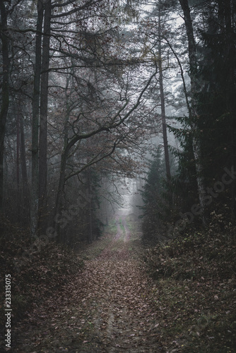 © Piotr Pomaranski, Fototapeta premium Moody, dark forest path covered with plenty of old leaves, mysterious trees. Autumn afternoon.