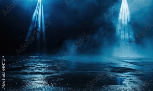 Obraz premium Moody dark stage with blue spotlights and fog. Dramatic lighting concept for...
