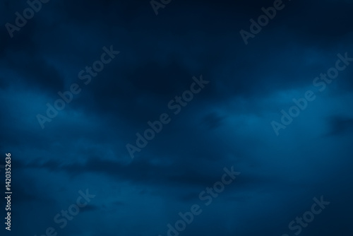 © Emvats, Obraz premium Moody, dramatic storm clouds fill a deep blue evening sky, creating a mysterious and intense atmosphere. Ideal as background or for thematic visuals.