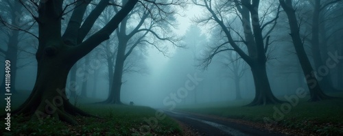 © Kachaphot, Naklejka premium Moody forest landscape with misty fog and twisted trees, ink, mystical