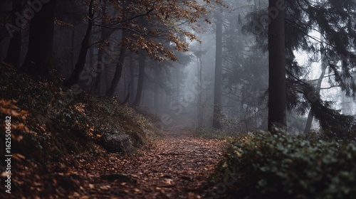 Fototapeta premium Moody Forest Path Covered in Autumn Leaves with Dense Fog and Tall Trees