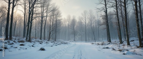 Naklejka premium Moody green atmosphere with snow-covered forest and bare trees, scenery,...