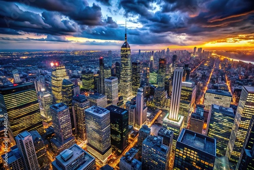 © Adisorn, Fototapeta premium moody metropolitan skyline aerial view night