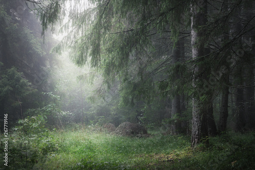 © smolskyevgeny, Obraz premium moody misty coniferous forest close up