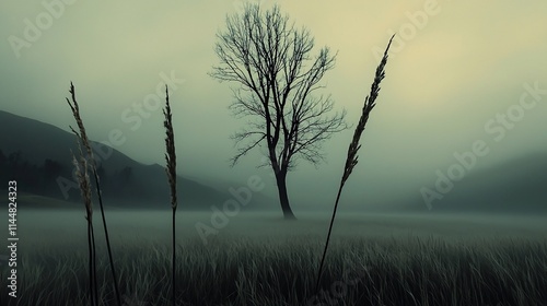 Obraz premium Moody misty landscape with grasses and lone tree.
