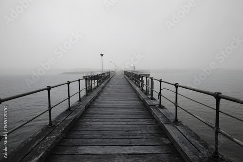 © li ying, Fototapeta premium Moody monochrome view of a long wooden pier extending into the sea under a hazy gray sky creates a serene coastal scene.