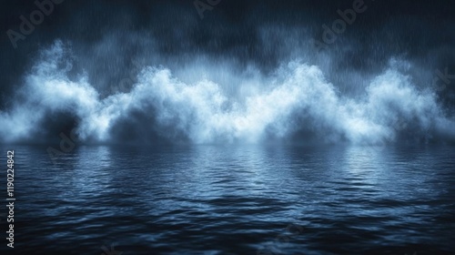 © Syafa, Fototapeta premium Moody Night Scene with Dark Clouds and Rain over Water