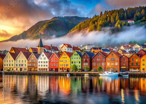© Caitlin, Obraz premium Moody Norse Revivalism capturing misty morning light dancing across intricate wooden facades of Bergen's colorful Bryggen Wharf houses, blending Nordic rusticity with urban bustle