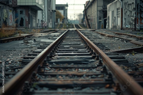 © anatolir, Naklejka premium Moody photo capturing the desolation of an abandoned railway track in an urban setting