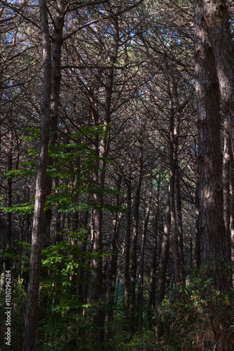 Obraz premium Moody pine forest view at daytime