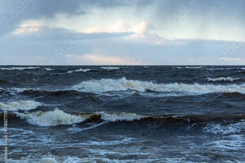 Fototapeta premium Moody sea view on a windy and cloudy day with waves at the Baltic sea n Latvia