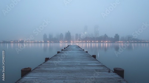 © Jakkarin, Naklejka premium Moody Urban Landscape: Gritty Industrial Pier at Dusk with City Skyline Reflection on Calm Waters - Cinematic Shot